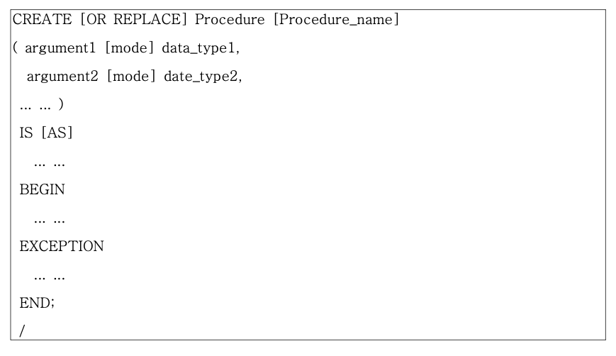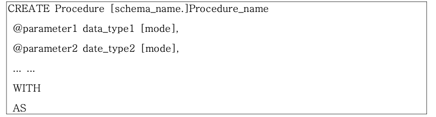 - CREATE TABLE 명령어로 테이블을 생성하듯 CREATE 명령어로 데이터베이스 내에 프로 시저를 생성할 수 있다.