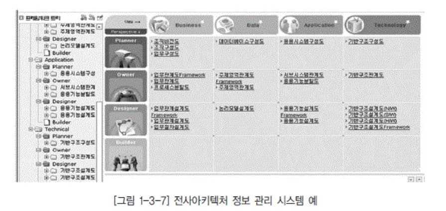 - 모델링 도구를 포함하는 정보 정의 도구 영역, 전사아키텍처 리포지터리(Repository), 전사아키텍처 포털로 구성된 정보 관리 영역, 전사아키텍처 정보 활용 영역으로 구분할 수 있다.
